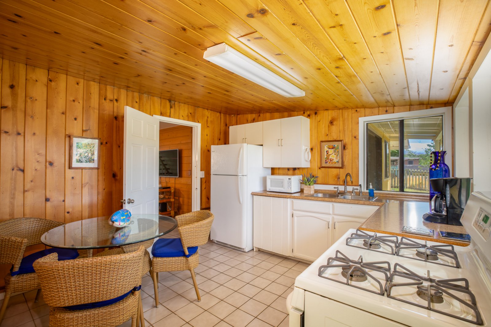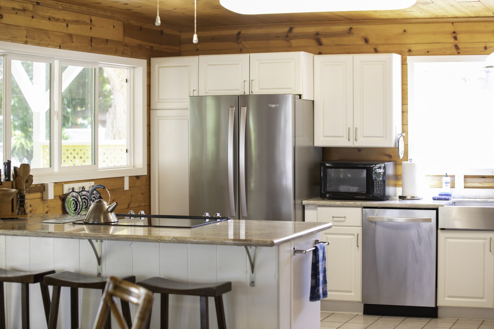 The kitchen boasts modern appliances and enough room for the group to cook and connect. Enjoy features like a refrigerator, coffee maker, stovetop, and ample counter space for all your culinary creations.